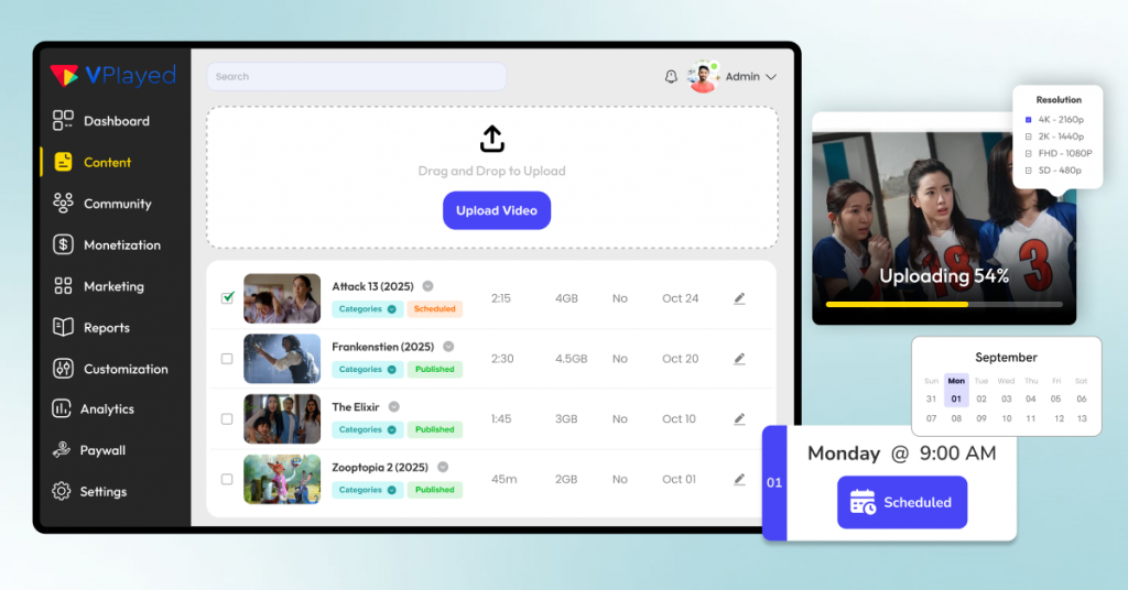 Upload, Manage, and Distribute Your Video Content through centralized video CMS with 1000+ Features and 10+ Revenue models.
